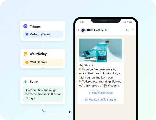 Automatically spot inactive customers and re-engage them with exclusive WhatsApp offers to quickly drive a new purchase.