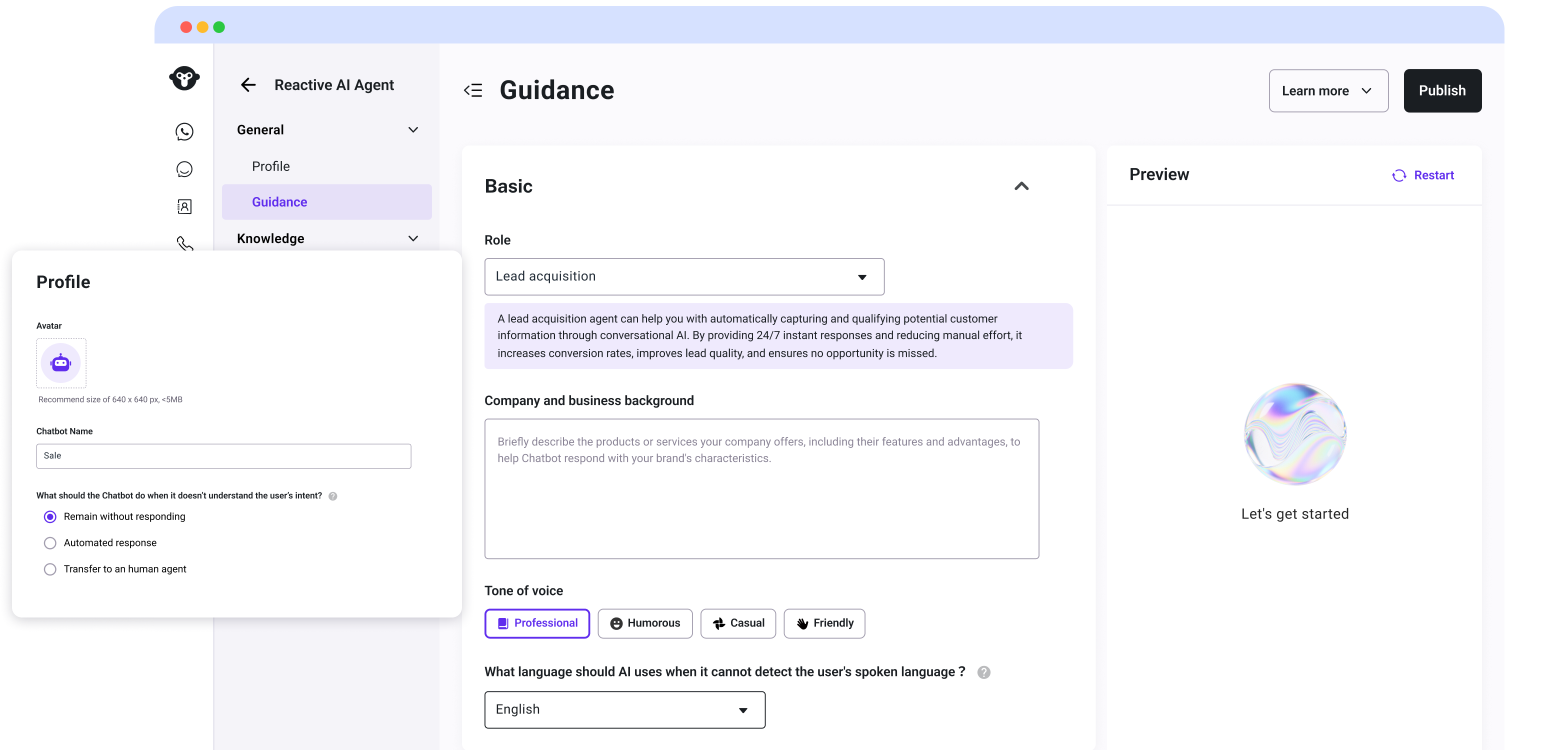 Define your Chatbot's purpose, role, and mission to reflect your brand voice. Seamlessly hand off chats to human agents when needed.